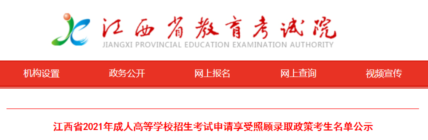 根據(jù)《江西省2021年成人高等學(xué)校招生工作規(guī)定》(贛招委字〔2021〕17號(hào))的要求,經(jīng)過(guò)考生所在縣(區(qū))招考機(jī)構(gòu)嚴(yán)格審核,現(xiàn)對(duì)江西省2021年成人高等學(xué)校招生考試申請(qǐng)享受照顧錄取政策的考生名單予以公示(享受25周歲以上加分照顧錄取政策的考生不在公示之列)。