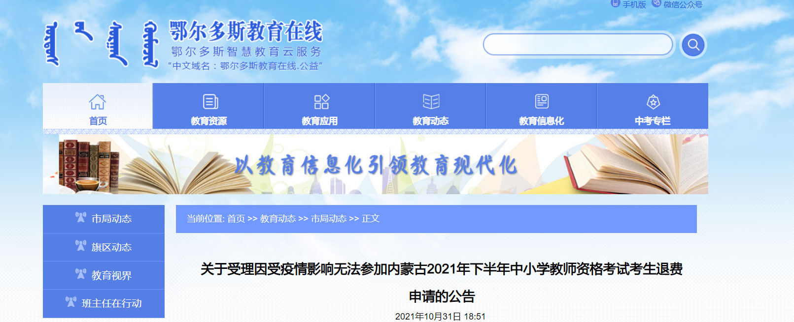 從鄂爾多斯教育在線獲悉,2021下半年內(nèi)蒙古鄂爾多斯中小學(xué)教師資格考試考生退費(fèi)申請(qǐng)的公告已公布,請(qǐng)相關(guān)人員仔細(xì)閱讀,具體詳情如下: