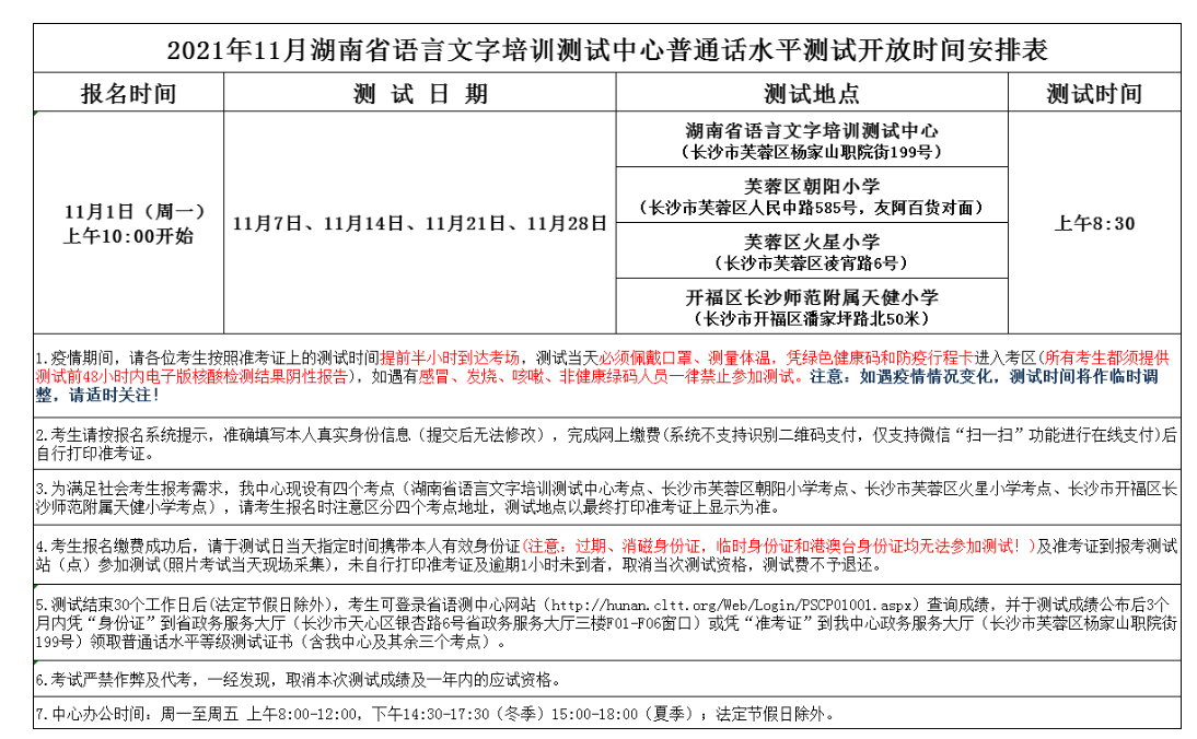 從湖南省教育廳發(fā)布的《2021年11月湖南省語言文字培訓(xùn)測試中心普通話水平測試開放時間安排表》得知,2021年11月湖南普通話成績查詢?nèi)肟趯⒂跍y試結(jié)束30個工作日后開通,請在規(guī)定時間內(nèi)進行查分,具體詳情如下: