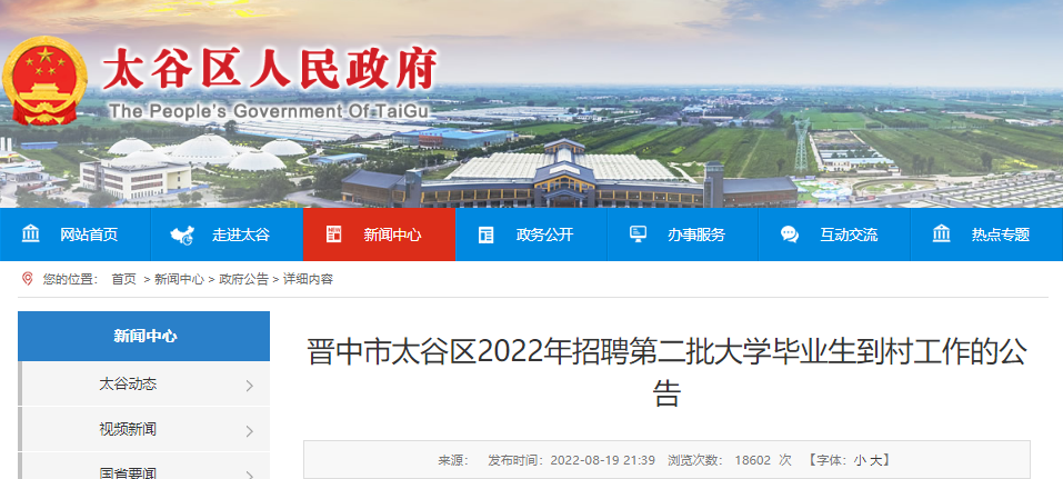 區(qū)招聘工作領(lǐng)導(dǎo)小組制定招聘實(shí)施方案,于2022年8月19日在晉中市太谷區(qū)人民政府網(wǎng)(http://www.taigu.gov.cn/)發(fā)布招聘公告。