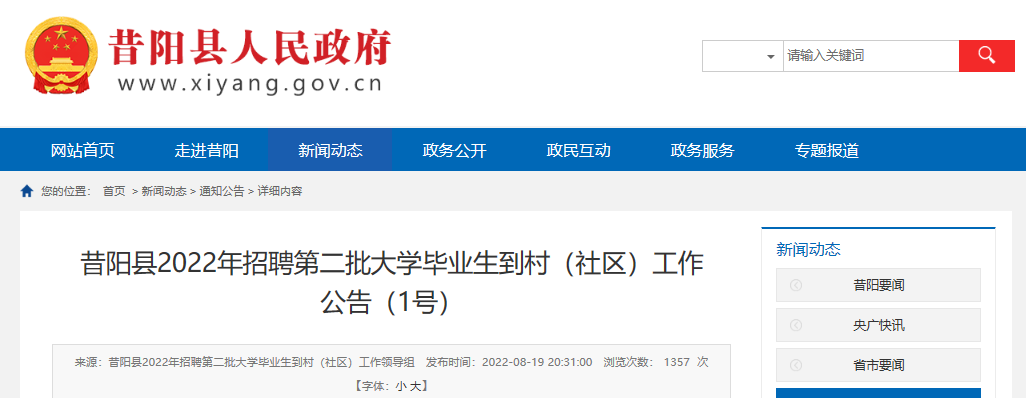 昔陽縣招聘第二批大學(xué)畢業(yè)生到村(社區(qū))工作領(lǐng)導(dǎo)組制定公開招聘實施方案,2022年8月19日通過昔陽縣人民政府網(wǎng)站、昔陽縣黨建網(wǎng)和昔陽組工先鋒號向社會發(fā)布招聘公告。