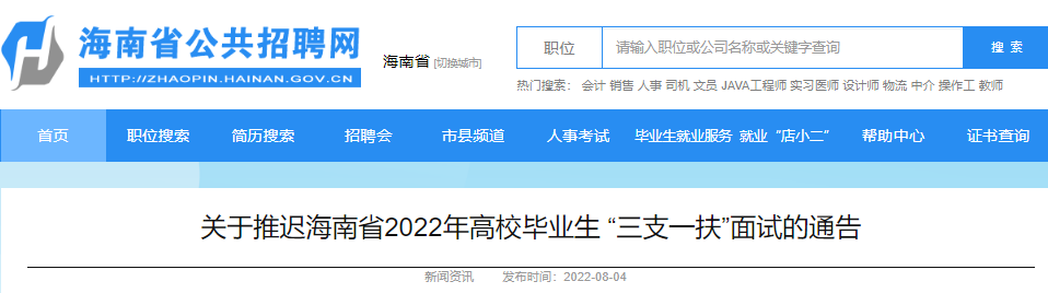 2022年海南省高校畢業(yè)生三支一扶面試推遲通告已公布,為了方便廣大考生的查閱,下面為您詳細(xì)介紹一下本次三支一扶面試推遲的具體事宜,希望廣大考生及時(shí)關(guān)注,如有相關(guān)疑問(wèn),請(qǐng)關(guān)注為您實(shí)時(shí)做出的更新。