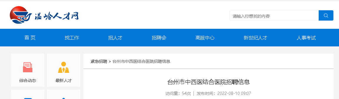 2022年浙江臺(tái)州市中西醫(yī)結(jié)合醫(yī)院招聘編外人員4人,報(bào)名時(shí)間:2022年8月20日截止,現(xiàn)將招聘公告原文發(fā)布如下: