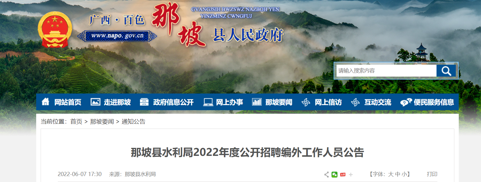 為充實(shí)和加強(qiáng)那坡縣水利局隊(duì)伍力量,決定面向社會(huì)招聘那坡縣水利局編外工作人員,現(xiàn)將有關(guān)事項(xiàng)公告如下: