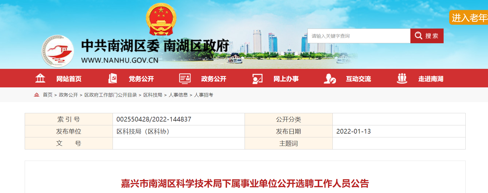 嘉興市南湖區(qū)科學(xué)技術(shù)局公開(kāi)選聘事業(yè)單位工作人員崗位表