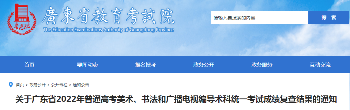 從廣東省教育考試院了解到,關(guān)于廣東省2022年普通高考美術(shù)、書法和廣播電視編導(dǎo)術(shù)科統(tǒng)一考試成績(jī)復(fù)查結(jié)果的通知已發(fā)布,詳細(xì)內(nèi)容如下: