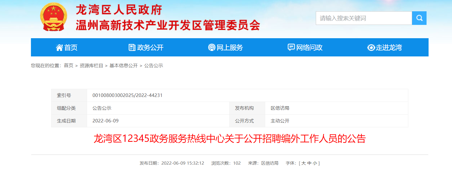 2022浙江省溫州市龍灣區(qū)12345政務(wù)服務(wù)熱線中心招聘編外人員公告已發(fā)布。報(bào)名時(shí)間:2022年6月9日-2022年6月17日?,F(xiàn)將招聘公告原文發(fā)布如下: