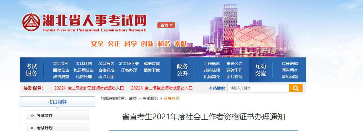 從湖北人事考試網(wǎng)獲悉,2021年湖北社會工作者資格證書辦理通知已公布,請相關(guān)人員仔細閱讀,具體詳情如下: