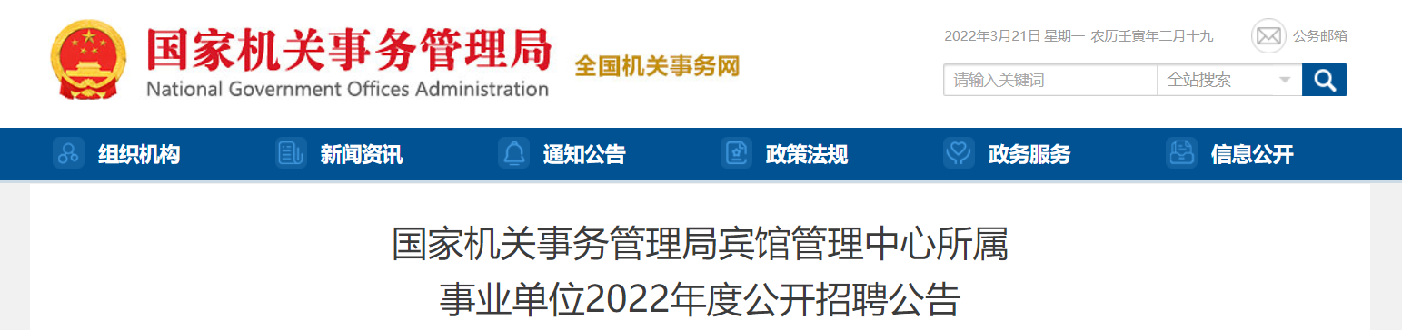 2022國(guó)家機(jī)關(guān)事務(wù)管理局賓館管理中心所屬事業(yè)單位招聘公告已發(fā)布。根據(jù)工作需要,國(guó)家機(jī)關(guān)事務(wù)管理局賓館管理中心所屬事業(yè)單位面向社會(huì)公開(kāi)招聘3名事業(yè)編制工作人員。為您整理了招聘條件和報(bào)名流程,供您參考。