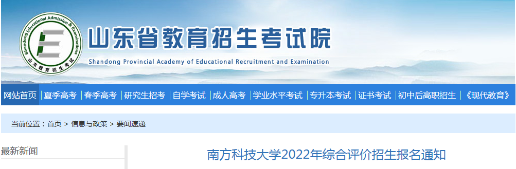 從山東省教育招生考試院了解到,南方科技大學(xué)2022年綜合評(píng)價(jià)招生報(bào)名通知已發(fā)布,詳細(xì)內(nèi)容如下: