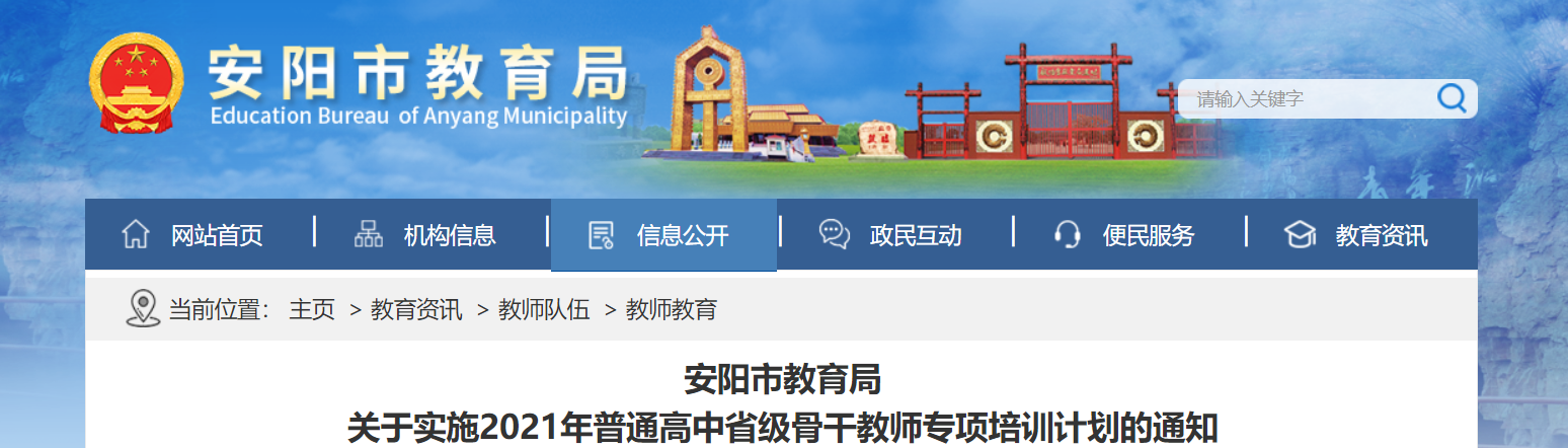 關(guān)于河南省安陽市教育局實施2021年普通高中省級骨干教師專項培訓(xùn)計劃的通知已發(fā)布。根據(jù)《河南省教育廳關(guān)于印發(fā)河南省新時代中小學教師梯隊攀升體系建設(shè)方案的通知》(教師〔2020〕107號)精神,決定實施2021年普通高中省級骨干教師專項培訓(xùn)計劃,現(xiàn)將有關(guān)事宜通知如下。為您整理了以下內(nèi)容,供您參考。
