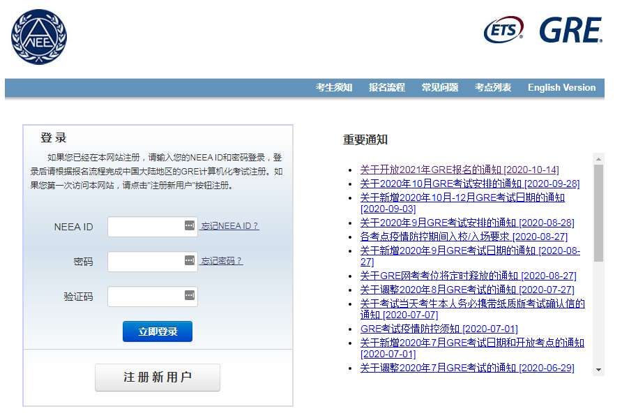 1.首先同學(xué)們需要登陸國家教育考試中心的GRE考試網(wǎng)站,鏈接如下:https://gre.neea.edu.cn/login.do。進(jìn)入之后應(yīng)該又回到了我們熟悉的界面。這回我們因為之前已經(jīng)注冊過了NEEAID和密碼(如果忘記了,同學(xué)們可以在你的郵箱中找到你的NEEAID)。如下圖: