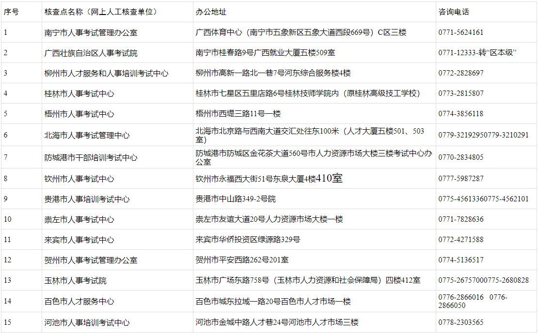 全區(qū)人事考試機(jī)構(gòu)(核查點(diǎn))地址及聯(lián)系方式如下: