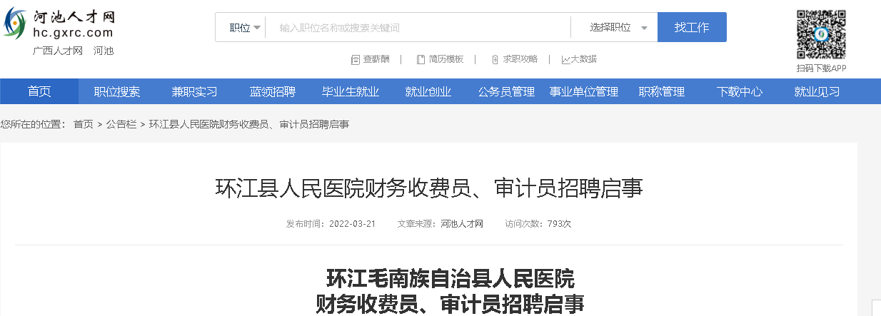 2022廣西河池市環(huán)江縣人民醫(yī)院財(cái)務(wù)收費(fèi)員、審計(jì)員招聘5人,報(bào)名時(shí)間:2022年4月30日截止,現(xiàn)將招聘公告原文發(fā)布如下: