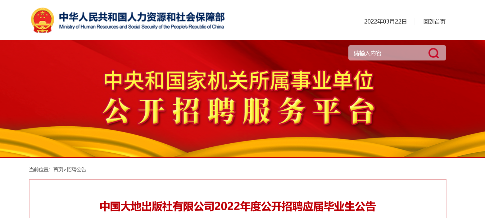 2022年度中國(guó)大地出版社有限公司招聘應(yīng)屆畢業(yè)生公告已發(fā)布。根據(jù)業(yè)務(wù)發(fā)展需要,中國(guó)大地出版社有限公司計(jì)劃面向2022年應(yīng)屆畢業(yè)生組織公開(kāi)招聘。為您整理了以下內(nèi)容,供您參考。