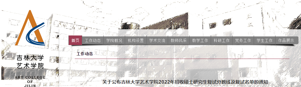 請進入復試名單的考生做好復試準備,同時加吉林大學藝術學院研招QQ:377805963,須實名備注“報考專業(yè)+姓名+手機號”。復試細則及其它要求、安排另行公布,請考生及時關注吉林大學藝術學院官方網(wǎng)站通知。