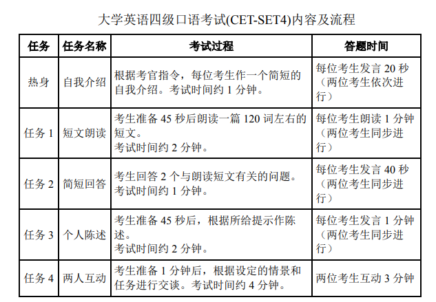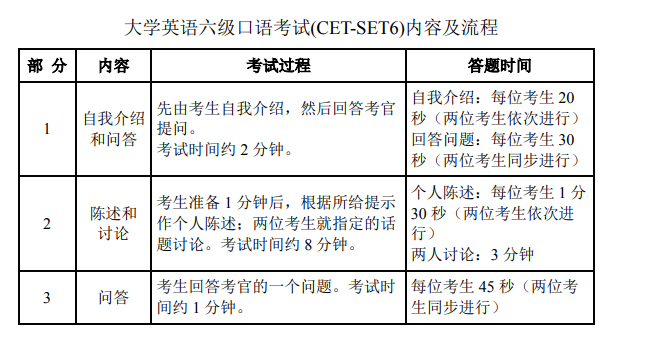 大學英語四、六級口語考試主要考核學生的英語口頭表達能力,具體為:就熟悉話題進行比較流利的會話能力;表達個人意見、情感、觀點的能力;陳述事實、理由和描述事件的能力??荚嚥捎糜嬎銠C化考試??忌谟嬎銠C上進行考生與模擬考官、考生與考生之間的互動。請?zhí)崆暗卿浫珖髮W英語四、六級考試網站(cet.neea.edu.cn),熟悉考試流程??荚噧热菁皶r間分配如下表所示:
