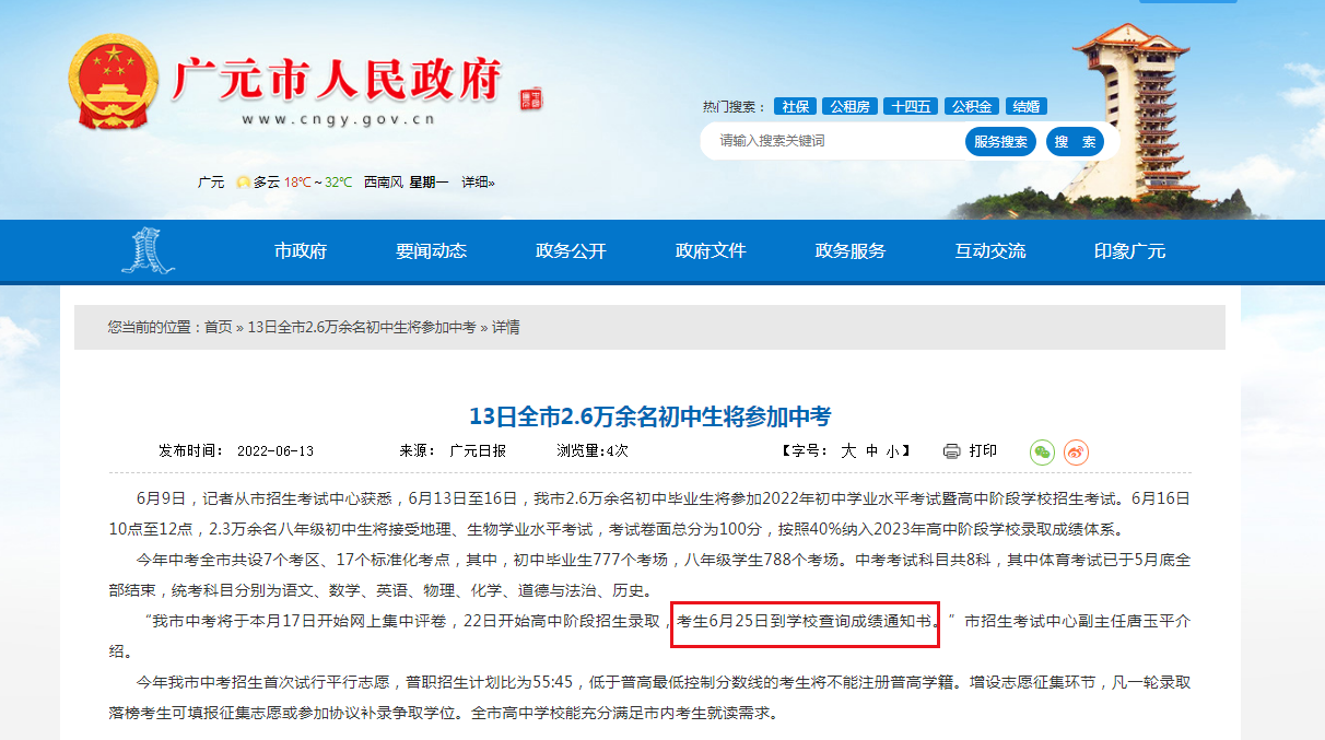 從廣元市人民政府網(wǎng)發(fā)布的《13日2.6萬余名初中生將參加中考》一文得知,6月25日到學(xué)校查詢成績通知書,具體詳情如下: