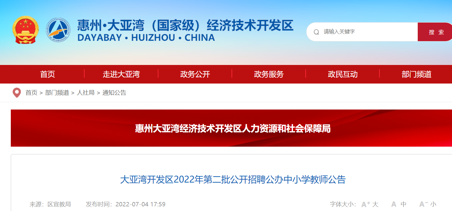 2022廣東惠州大亞灣開發(fā)區(qū)第二批招聘公辦中小學教師670人,報名時間:2022年7月18日—20日,現(xiàn)將招聘公告原文發(fā)布如下: