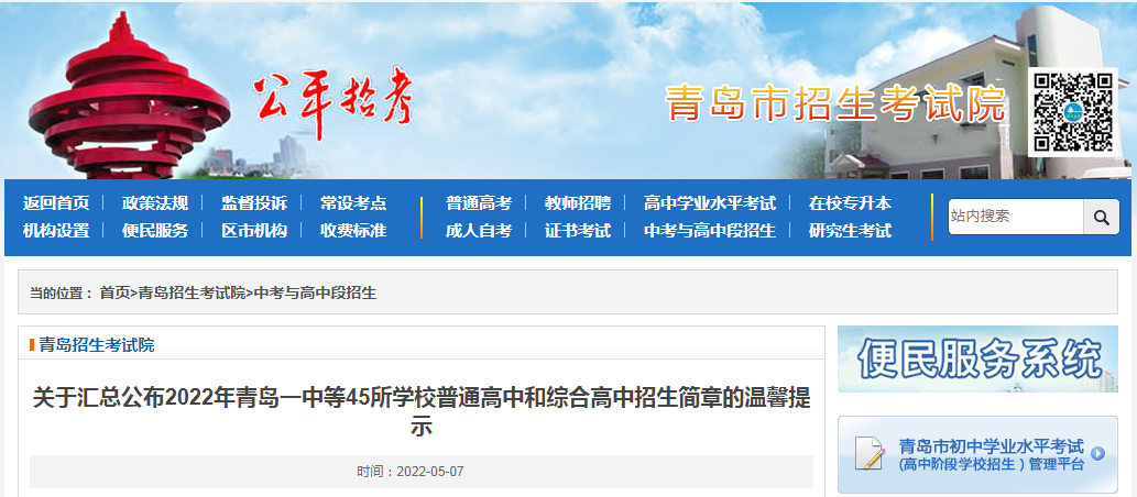 為方便查詢有關(guān)學(xué)校招生簡章,現(xiàn)將青島一中等45所學(xué)校制定的2022年普通高中和綜合高中招生簡章予以匯總公布。