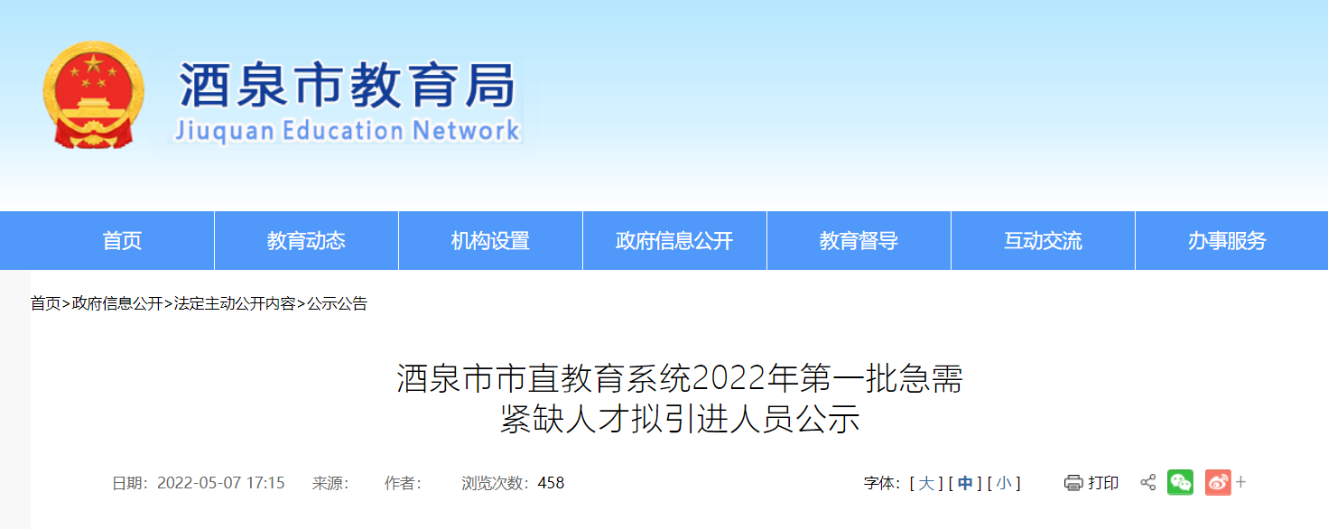 2022年甘肅酒泉市市直教育系統(tǒng)第一批急需緊缺人才擬引進人員公示已發(fā)布,公示時間為2022年5月7日至5月12日,現(xiàn)將原文發(fā)布如下: