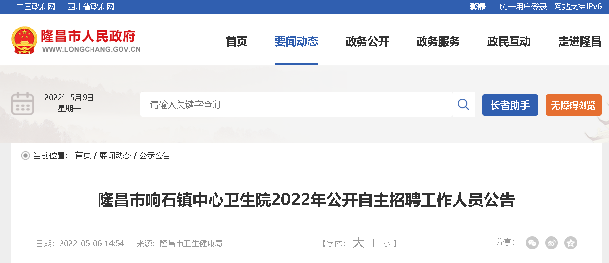 2022四川內(nèi)江市隆昌市響石鎮(zhèn)中心衛(wèi)生院自主招聘2人,報(bào)名時(shí)間:2022年5月7日至5月14日,現(xiàn)將招聘公告原文發(fā)布如下:
