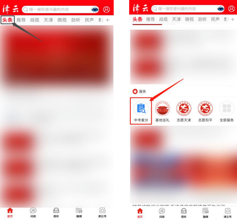 通過“津云”客戶端查詢。進入津云客戶端后,點擊“頭條”欄目頁。在“頭條”欄目頁的服務(wù)板塊中查找“中考查分”按鈕,點擊進入后,即可進行查詢。
