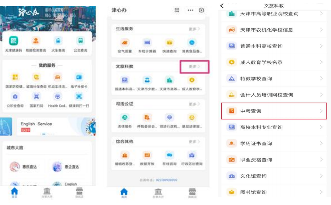 通過“津心辦”APP查詢。登錄“津心辦”APP、“津心辦”支付寶小程序,在“文旅科教”服務(wù)中找到功能查詢?nèi)肟?,點擊“中考查詢”專區(qū),進入查詢頁面,即可進行查詢。