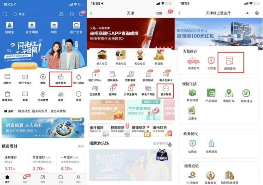 通過招商銀行APP查詢。打開招商銀行App,點擊首頁“城市服務(wù)”;點擊“更多服務(wù)”,進入天津線上營業(yè)廳;點擊“成績查詢”,進入查詢頁面,即可進行查詢。