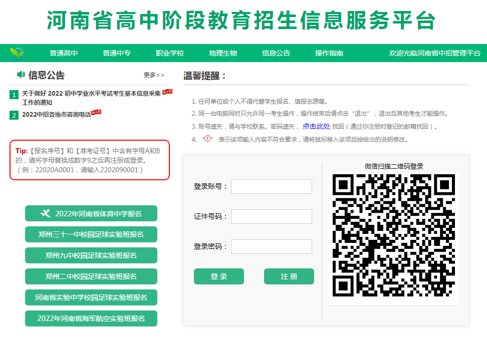①登錄賬號:即考生的報名序號。(中招報名后為中招考號)