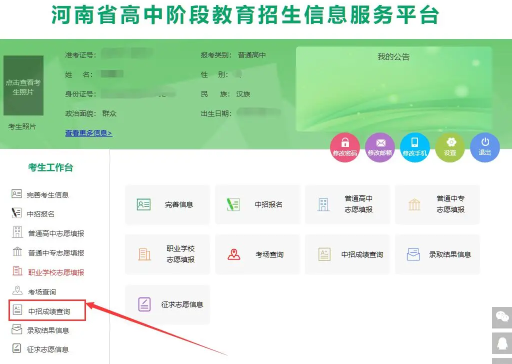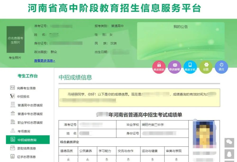 考生可以在有效時間范圍內查看自己的中招考試成績。如下圖: