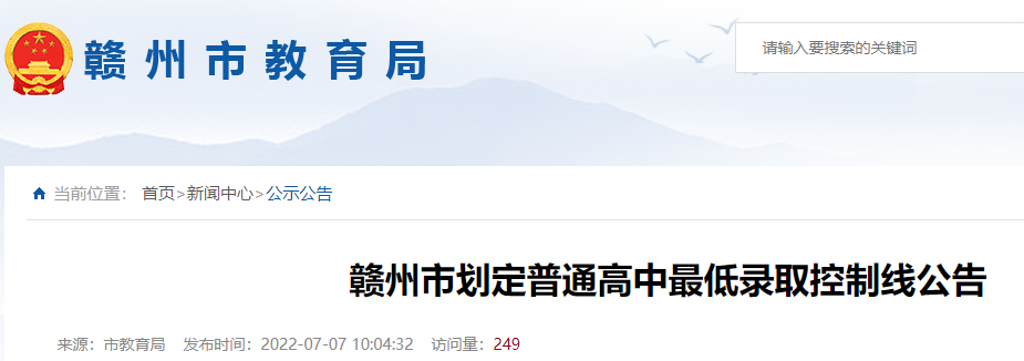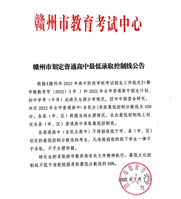 小編根據(jù)贛州市教育局發(fā)布“贛州市劃定普通高中最低錄取控制線公告”得知,2022年江西贛州中考分?jǐn)?shù)線已公布,詳情如下: