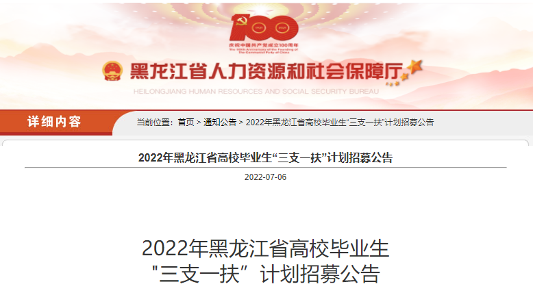 黑龍江省人力資源和社會(huì)保障廳發(fā)布了《2022年黑龍江省高校畢業(yè)生“三支一扶”計(jì)劃招募公告》,從公告中獲悉,2022年黑龍江三支一扶報(bào)名時(shí)間:7月11日-15日,具體事宜詳見《招考公告》,小編在此將相關(guān)信息摘錄如下,預(yù)祝大家順利通過!