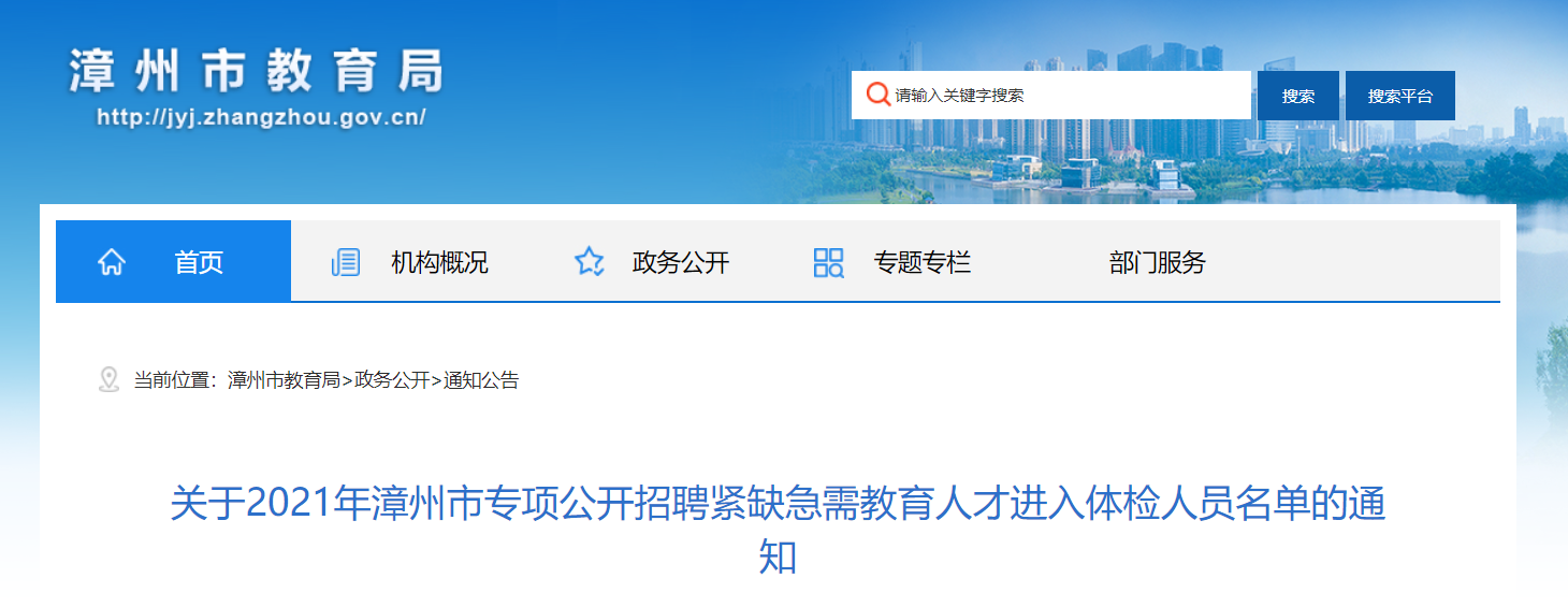 2021年福建省漳州市專項公開招聘緊缺急需教育人才進入體檢人員名單通知已發(fā)布。根據(jù)《漳州市教育局漳州市人力資源和社會保障局關(guān)于印發(fā)2021年漳州市專項公開招聘緊缺急需教育人才方案的通知》(漳教人〔2021〕217 號)以及省、市有關(guān)招考文件規(guī)定,現(xiàn)將2021年漳州市直有關(guān)學(xué)校專項公開招聘緊缺急需教育人才進入體檢人員名單予以公布(詳見附件),并就有關(guān)事項通知如下。為您整理了以下內(nèi)容,供您參考。