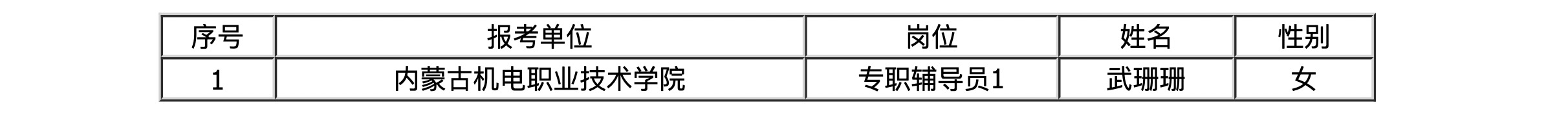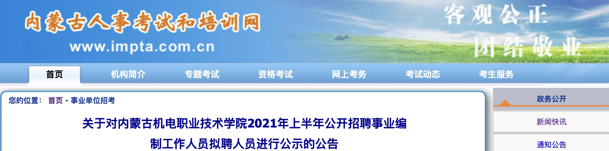 根據(jù)《內(nèi)蒙古自治區(qū)直屬事業(yè)單位公開招聘工作人員總體方案》(內(nèi)人社辦發(fā)〔2019〕61號)和《內(nèi)蒙古機(jī)電職業(yè)技術(shù)學(xué)院2021年上半年公開招聘事業(yè)編制工作人員簡章》文件要求,經(jīng)過網(wǎng)上報(bào)名、資格初審、筆試、資格復(fù)審、面試、體檢(因體檢時(shí)懷孕未作X光檢查,現(xiàn)已體檢)、考察等環(huán)節(jié),決定擬聘工作人員1名并予以公示。