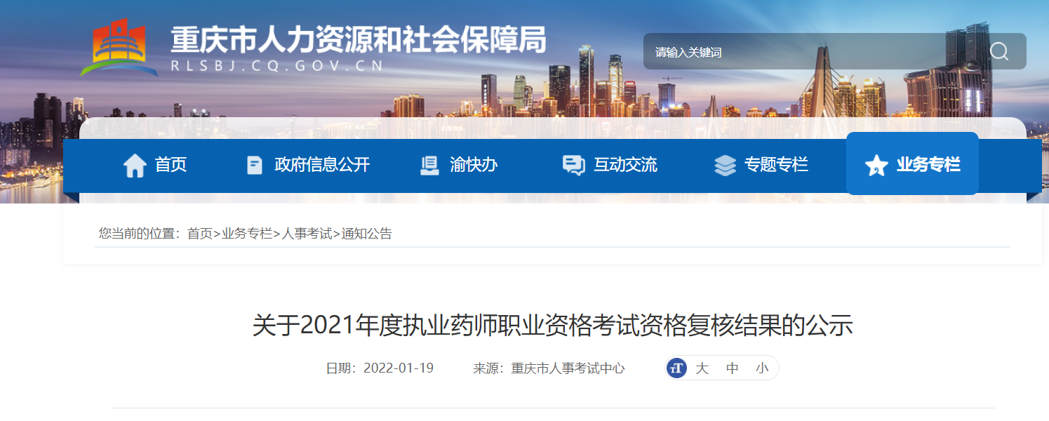 從重慶市人力資源和社會(huì)保障局獲悉,2021年重慶執(zhí)業(yè)藥師職業(yè)資格考試資格復(fù)核結(jié)果的公示已公布,請(qǐng)相關(guān)人員仔細(xì)閱讀,具體詳情如下: