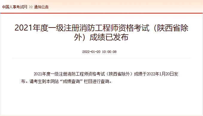 #】從中國(guó)人事考試網(wǎng)獲悉,2021年一級(jí)消防工程師成績(jī)于2022年1月20日公布,考生通過(guò)點(diǎn)擊左側(cè)導(dǎo)航中“成績(jī)查詢”,輸入“用戶名”、“密碼”進(jìn)行查分。小編整理了一級(jí)消防工程師成績(jī)查詢相關(guān)信息如下: