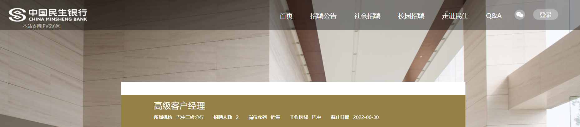 2022民生銀行四川巴中二級(jí)分行高級(jí)客戶(hù)經(jīng)理社會(huì)招聘2人,報(bào)名時(shí)間:2022年6月30日截止,現(xiàn)將招聘詳情發(fā)布如下: