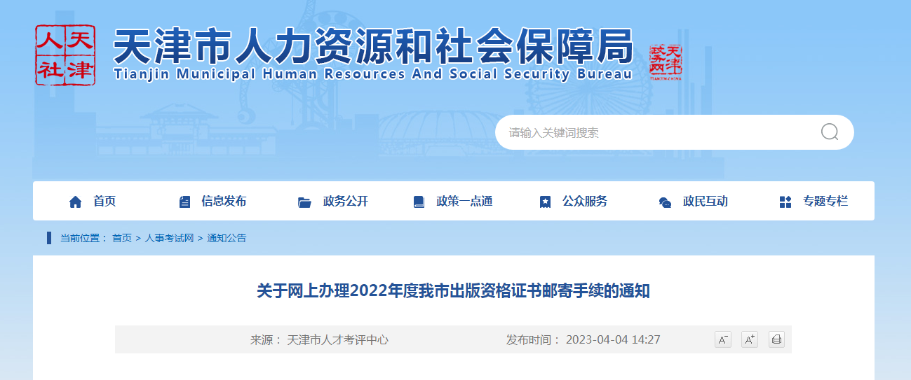 從天津市人力資源和社會(huì)保障局獲悉,2022年天津出版資格證書郵寄手續(xù)網(wǎng)上辦理的通知已公布,2023年4月6日起郵寄信息采集,具體詳情如下: