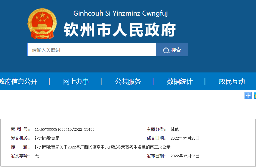 中考頻道從欽州市人民政府了解到,欽州市教育局關(guān)于2022年廣西民族高中民族班擬錄取考生名單的第二次公示,詳情如下: