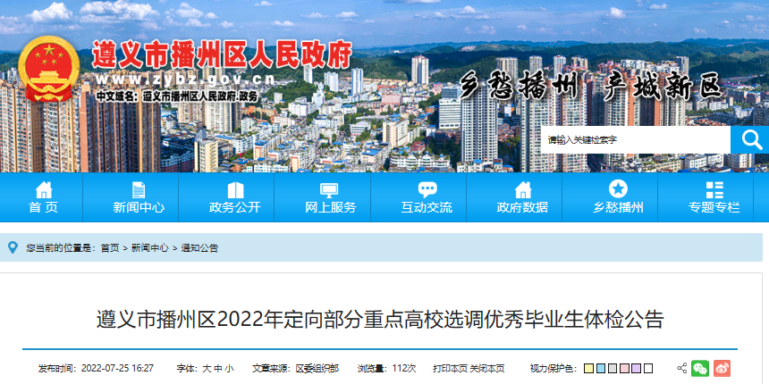 根據(jù)《貴州省2022年定向部分重點(diǎn)高校選調(diào)優(yōu)秀畢業(yè)生公告》有關(guān)規(guī)定,為做好遵義市播州區(qū)2022年定向部分重點(diǎn)高校選調(diào)優(yōu)秀畢業(yè)生體檢工作,現(xiàn)將有關(guān)事宜公告如下: