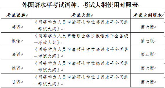 以同等學力申請碩士學位人員(以下簡稱同等學力人員)須參加外國語水平考試,應(yīng)試語種應(yīng)與申請學位相應(yīng)學科在校碩士研究生培養(yǎng)方案規(guī)定的語種相同。全國統(tǒng)一組織的外國語水平考試主要語種為英語、俄語、法語、德語和日語,考試大綱見下圖。