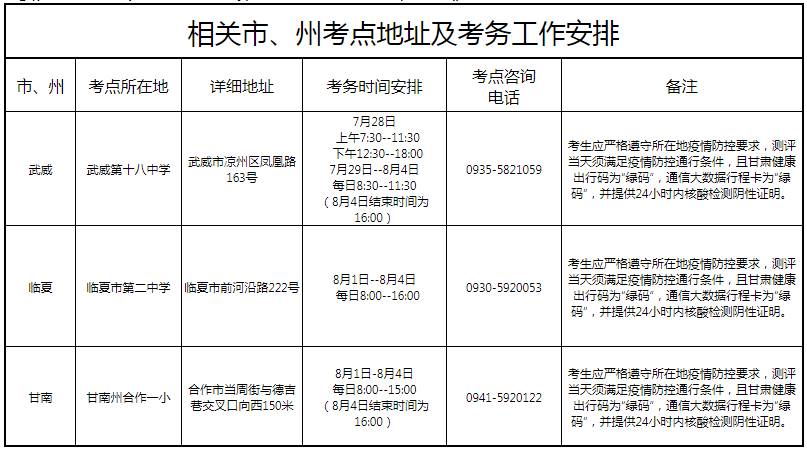 結合疫情防控有關要求,現(xiàn)將武威市、臨夏州、甘南州開展面試、體檢、體能測評時間和地點公布如下(詳見下表)。請考生嚴格遵守所在地疫情防控要求,在滿足疫情防控通行條件的情況下,按公告要求參加測評。對未確定開展時間和地點的,后續(xù)我們將以公告的方式另行通知考生,請考生耐心等待,并密切關注甘肅省教育考試院、甘肅省公安廳網站,確保第一時間了解相關信息。