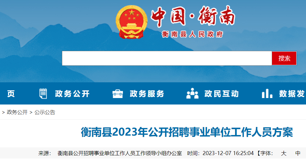 在人事考試報名網(wǎng)(http://www.dcpta.com.cn)、衡陽市人力資源和社會保障局(http://www.hengyang.gov.cn/hysrsj)、衡南縣人民政府網(wǎng)(http://www.hengnan.gov.cn)發(fā)布招聘公告。公告時間為2023年12月7日至12月15日(共7個工作日)。