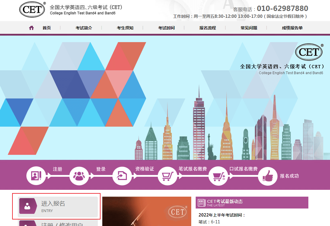 即日起報名(大部分院校在3月16日-3月28日期間進行報名,請考生按自己所在學校規(guī)定的時間登陸CET網(wǎng)上報名系統(tǒng)自行報名),請在報名完成后24小時內(nèi)完成繳費,并再次登錄系統(tǒng)確認是否報名成功,如有疑問可撥打客服電話進行咨詢。