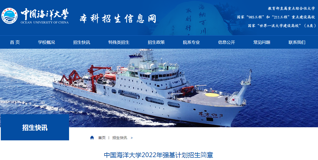 高考頻道從中國(guó)海洋大學(xué)本科招生網(wǎng)了解到,山東省中國(guó)海洋大學(xué)2022年強(qiáng)基計(jì)劃招生簡(jiǎn)章已發(fā)布,詳情如下:
