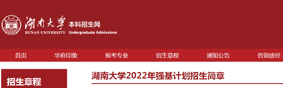 高考頻道從湖南大學(xué)本科招生網(wǎng)了解到,湖南大學(xué)2022年強(qiáng)基計(jì)劃招生簡章已發(fā)布,詳情如下: