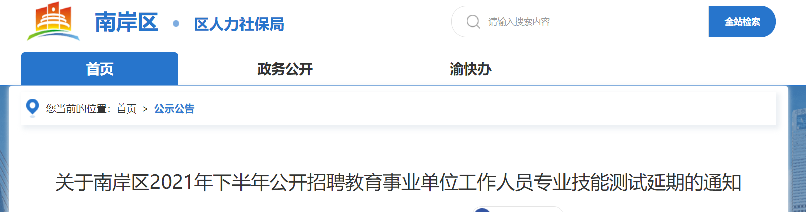根據(jù)市區(qū)新冠肺炎疫情防控要求及工作安排,經(jīng)慎重研究決定,南岸區(qū)2021年下半年公開(kāi)招聘教育事業(yè)單位工作人員專業(yè)技能測(cè)試延期,專業(yè)技能測(cè)試及后續(xù)環(huán)節(jié)相關(guān)事項(xiàng)視疫情防控形勢(shì)另行通知。通知將在重慶市南岸區(qū)人民政府網(wǎng)(http://www.cqna.gov.cn/)公示公告欄目公開(kāi)發(fā)布。