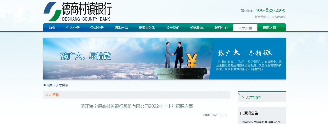 2022浙江海寧德商村鎮(zhèn)銀行股份有限公司上半年招聘若干人,報名時間:2022年2月16日截止,現(xiàn)將招聘公告原文發(fā)布如下: