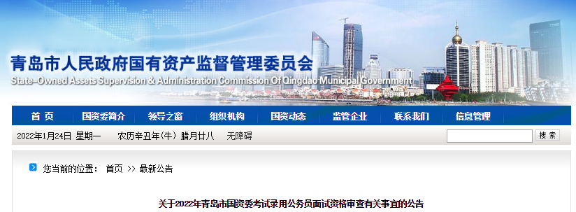 2022年山東青島市國資委考試錄用公務(wù)員面試資格審查有關(guān)事宜公告已公布,為了方便廣大考生的查閱,下面為您詳細(xì)介紹一下本次公務(wù)員面試資格審查的具體事宜,希望廣大考生及時(shí)關(guān)注,如有相關(guān)疑問,請關(guān)注公務(wù)員頻道為您實(shí)時(shí)做出的更新。